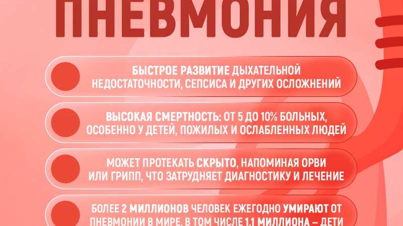 Пневмония — это острое воспаление легочной ткани. Его провоцирует инфекция, которая поражает альвеолы (воздушные мешочки) в одном или обоих легких. При пневмонии альвеолы заполняются патологической жидкостью, это делает дыхание болезненным и ограничивает поступление кислорода. Основные симптомы - повышение температуры, одышка, сухой или влажный кашель, болевые ощущения в области груди, усиливающиеся при глубоком вдохе, общая слабость, головная боль. Объективных экспресс-тестов на пневмонию не существует: диагноз ставит врач по клиническим проявлениям, а также по изменениям на рентгенограмме: это «золотой стандарт» диагностики заболевания. Поэтому чрезвычайно важно вовремя обратиться за медицинской помощью, не занимаясь самолечением.