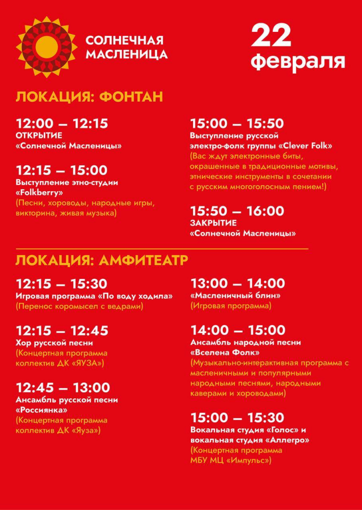 22 февраля — день, когда песни поются, хороводы кружатся, а сказки оживают! Здесь каждый найдёт свой кусочек масленичного чуда — от традиционных плясок до современного фольклора!