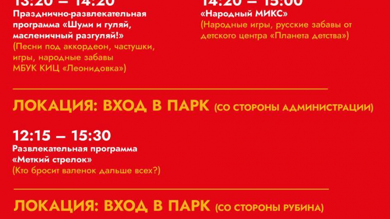 С 12 часов в "Парке Мира" вас ждут интерактивные площадки, мастер-классы, игры, забавы, вкусные блины и горячий чай!