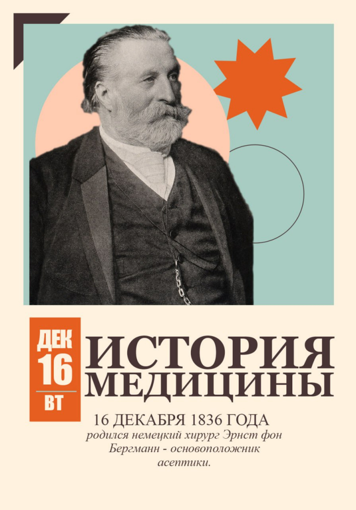 16 декабря 1836 года родился немецкий хирург Эрнст фон Бергманн - основоположник асептики, автор одних из первых классических руководств по проблемам нейрохирургии и военно-полевой хирургии.