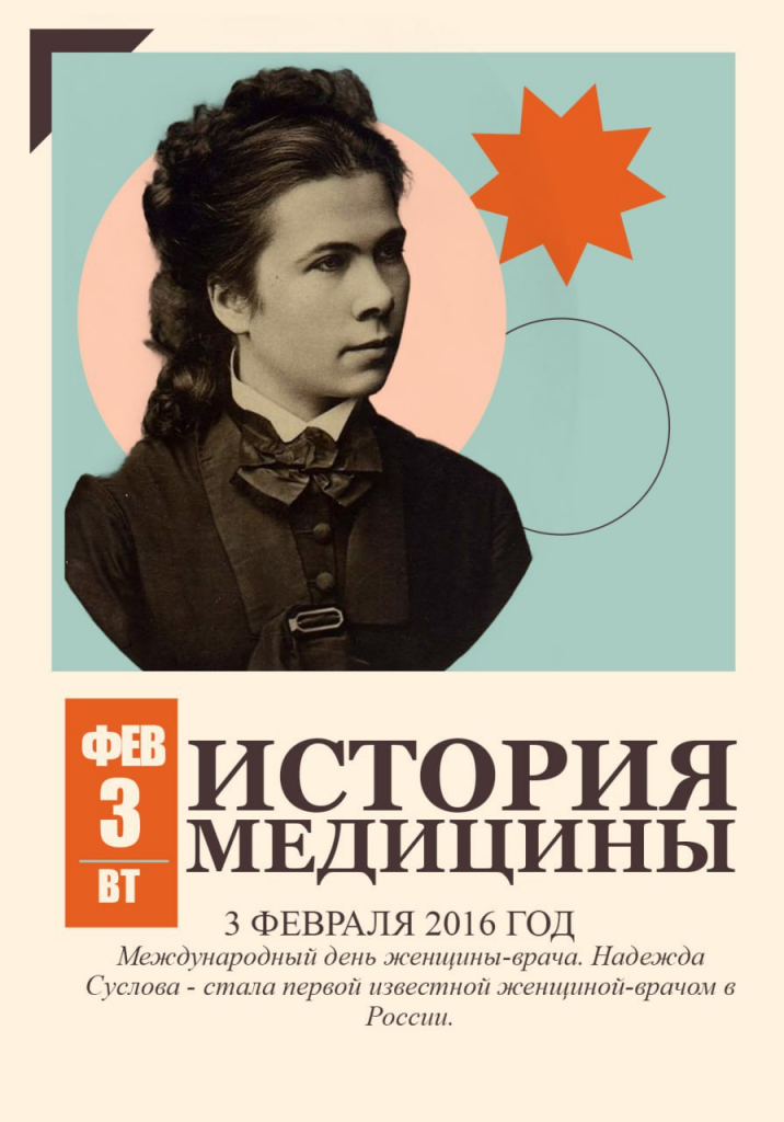 Надежда Суслова - стала первой известной женщиной врачом в России. Высшее образование в 1860-е годы ей пришлось получать за границей, в Цюрихе. Она добилась допуска к экзаменам в России, чтобы работать врачом. Председателем экзаменационной комиссии был знаменитый профессор Боткин, высоко оценивший познания Надежды. Впоследствии Суслова работала акушером-гинекологом в столице и в родной Нижегородской губернии.