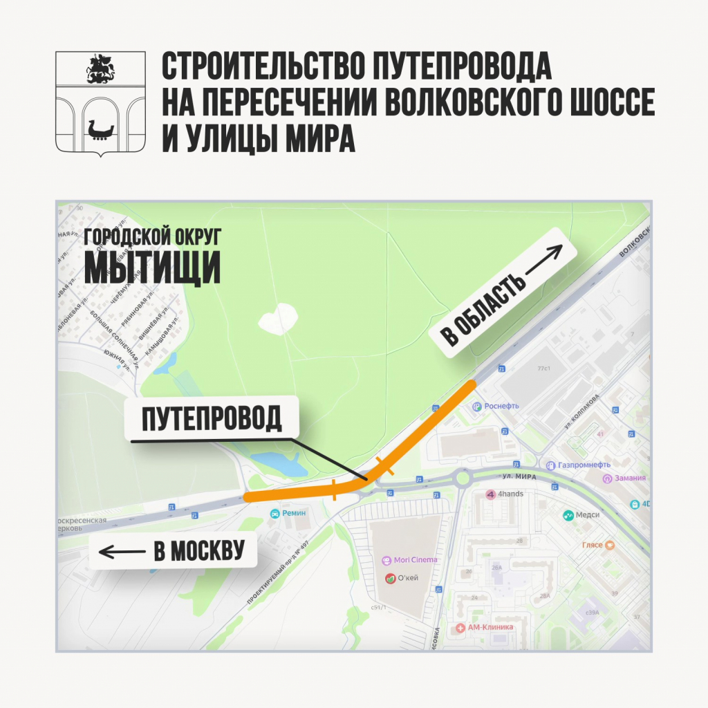 Уважаемые мытищинцы! В связи со строительством путепровода на пересечении Волковского шоссе и улицы Мира в городе Мытищи в зоне проведения работ будет ограничено движение. Оно будет осуществляться по 4-м полосам.