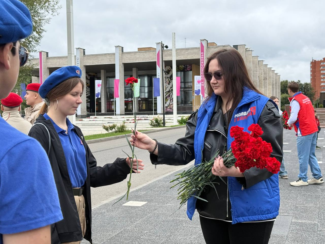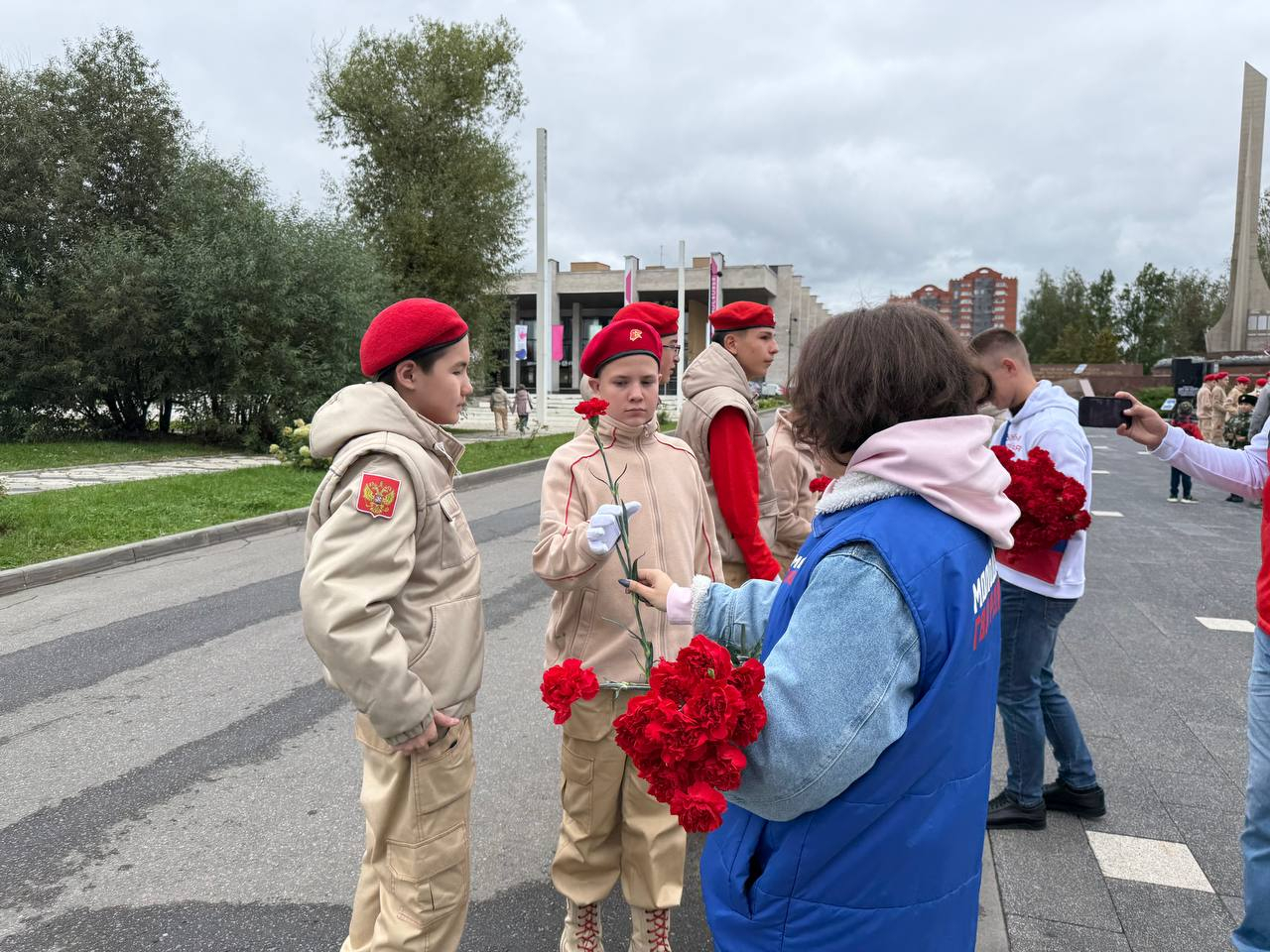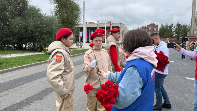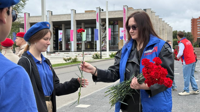 Молодогвардейцы не только сами приняли участие в возложении цветов к памятнику, но и помогали в организации мероприятия: раздавали цветы жителям и следили за порядком во время проведения митинга.