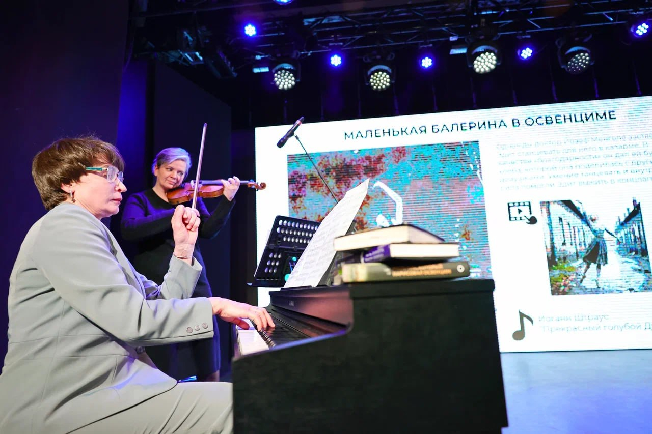 Мероприятие включало показ документальных и художественных кинокадров, а также чтение исторических фактов, сопровождавшихся живой музыкой. Пианистка Елена Кабаргина и скрипачка Наталья Буянова исполнили произведения, звучавшие в концлагерях. Репертуар охватывал как музыку немецких композиторов (Брамса, Штрауса, Бетховена), которую нацисты использовали для пропаганды расового превосходства, так и марши, и танцевальные композиции.