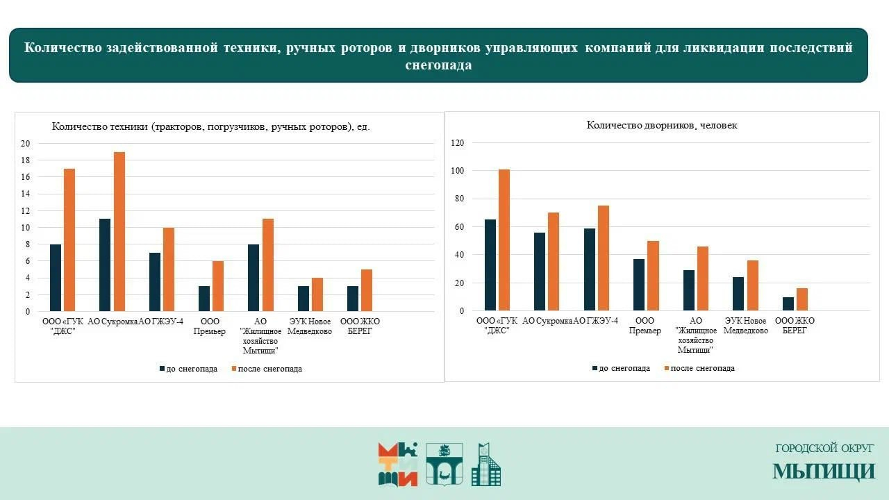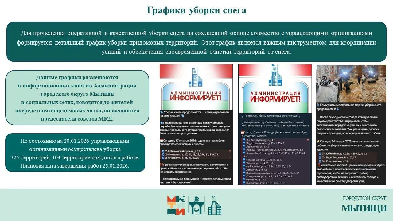 Администрация округа совместно с Единой Россией обеспечивает контроль за работой служб и оперативное реагирование на обращения жителей. В уборке территорий и помощи жителям участвуют коммунальные службы, волонтеры городского округа Мытищи и активисты «Молодой Гвардии».