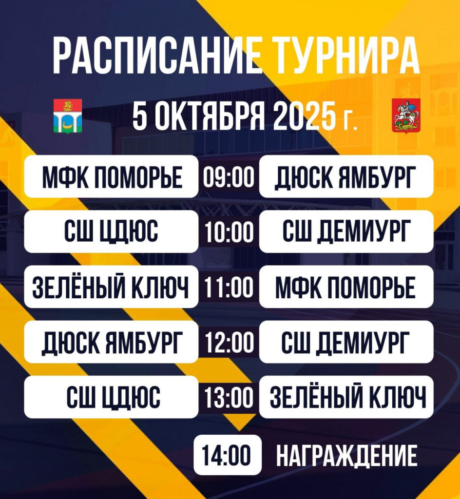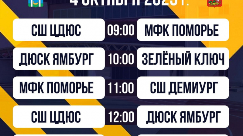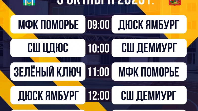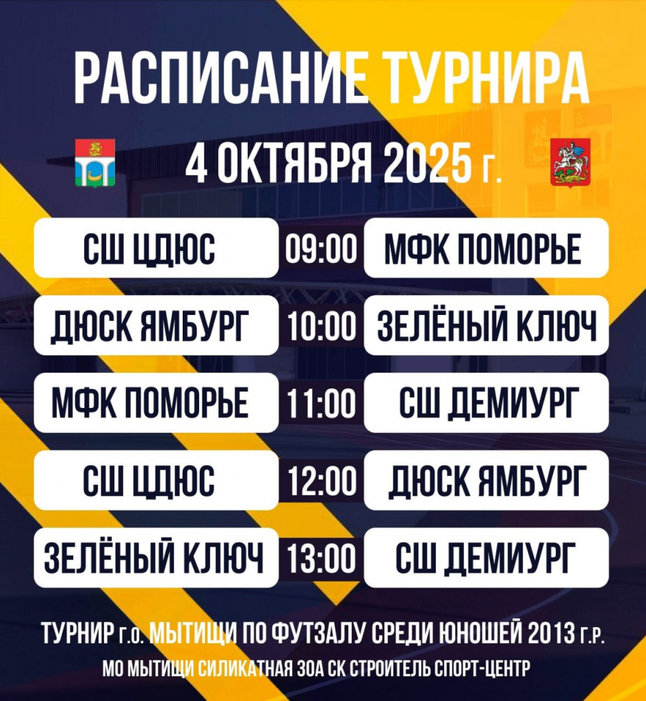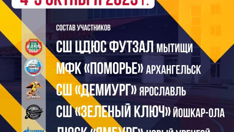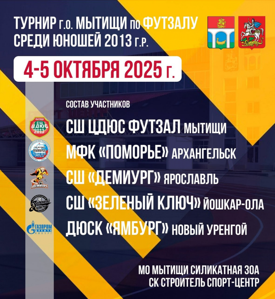 4–5 октября в спортцентре СК «Строитель» в Мытищах пройдет всероссийский турнир по футзалу среди юношей 2013 года рождения. В соревнованиях примут участие пять команд – из Мытищ, Архангельска, Ярославля, Йошкар-Олы и Нового Уренгоя.