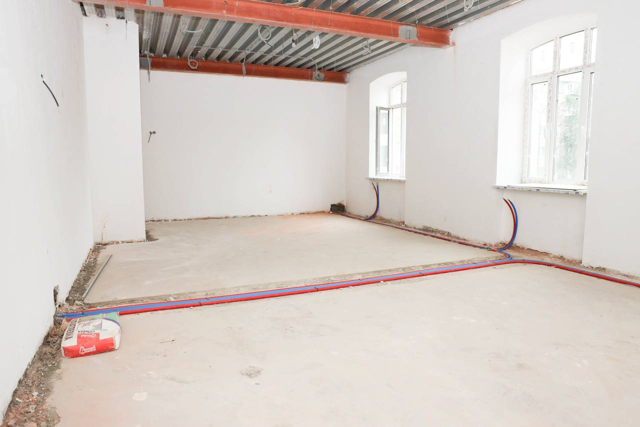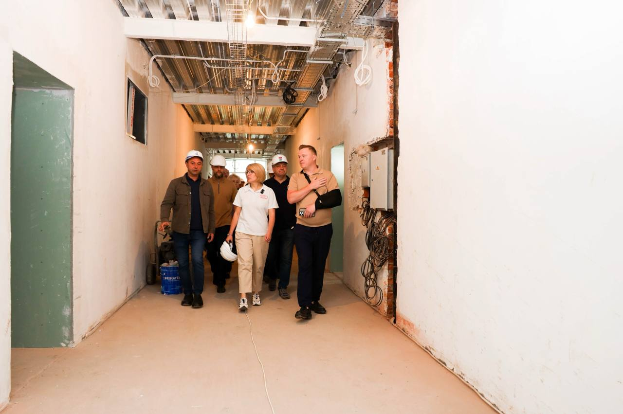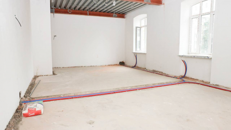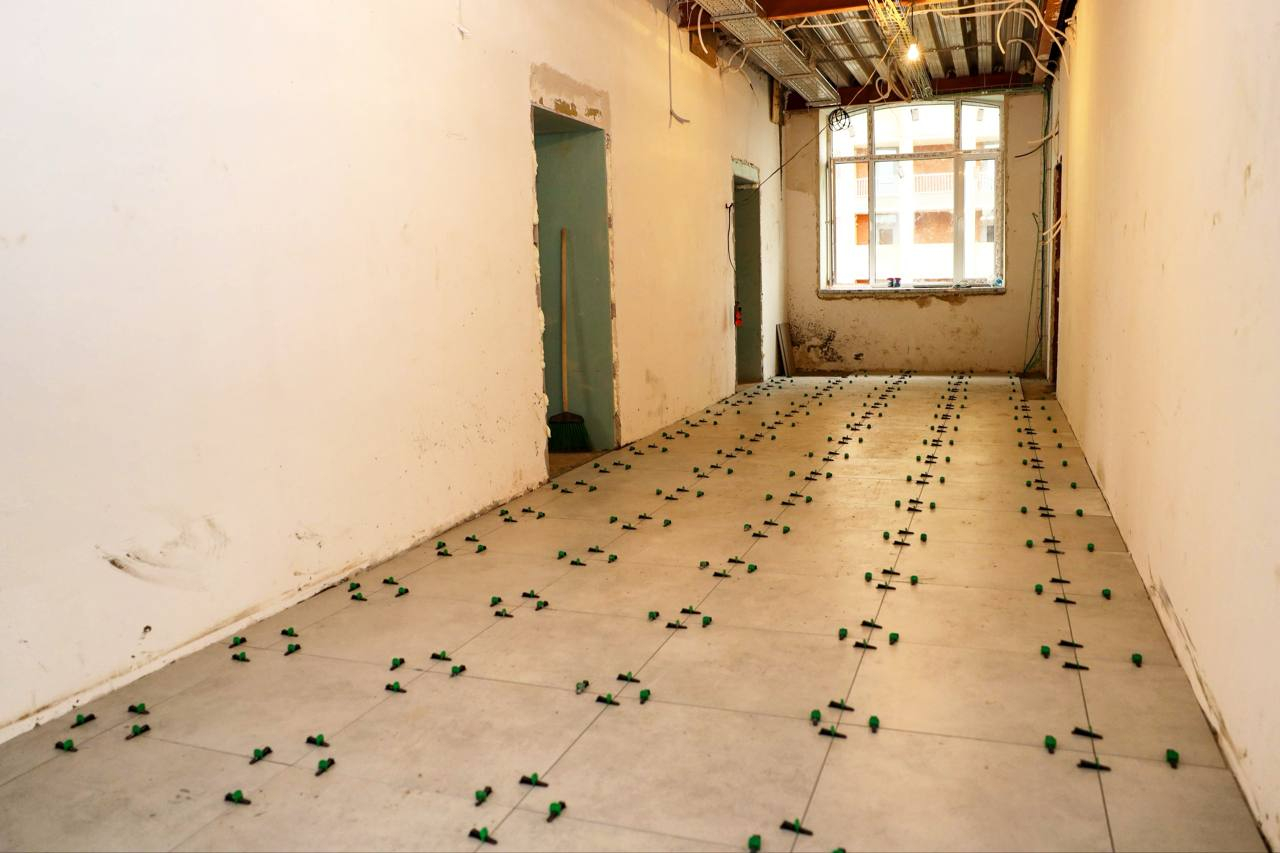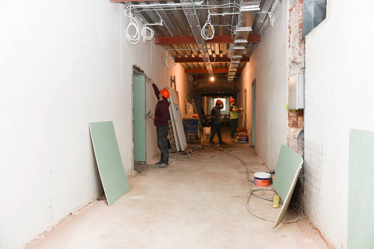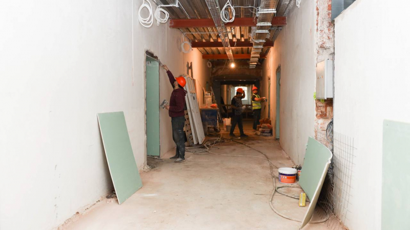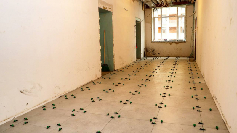 -  Внутри здания ведутся чистовая отделка помещений, устройство напольной плитки в коридорах, монтаж слаботочных систем и оборудования санузлов.