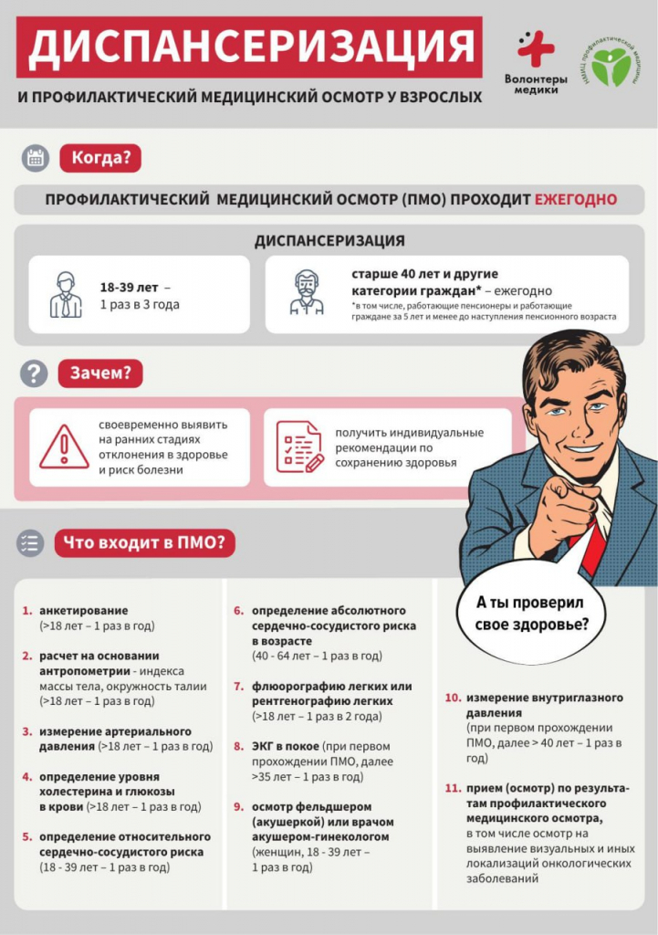 Диспансеризацию в возрасте 18–39 лет следует проходить 1 раз в 3 года, а в возрасте 40 лет и старше – ежегодно.