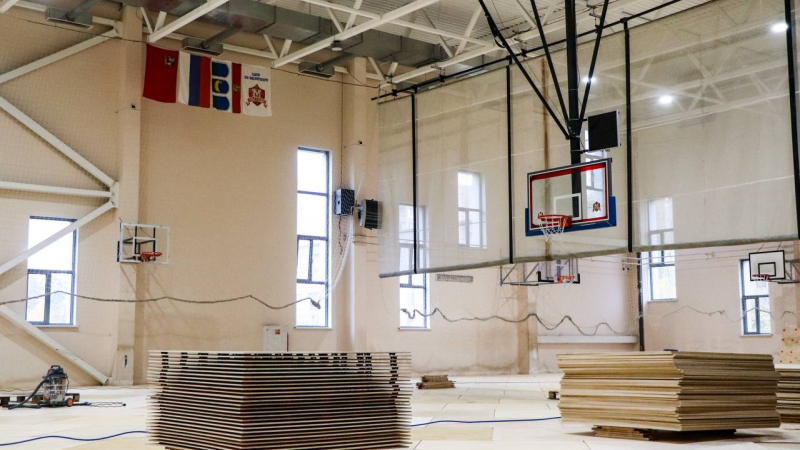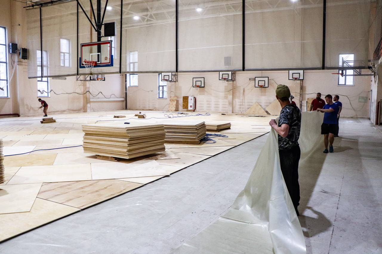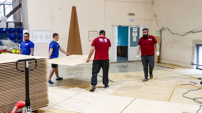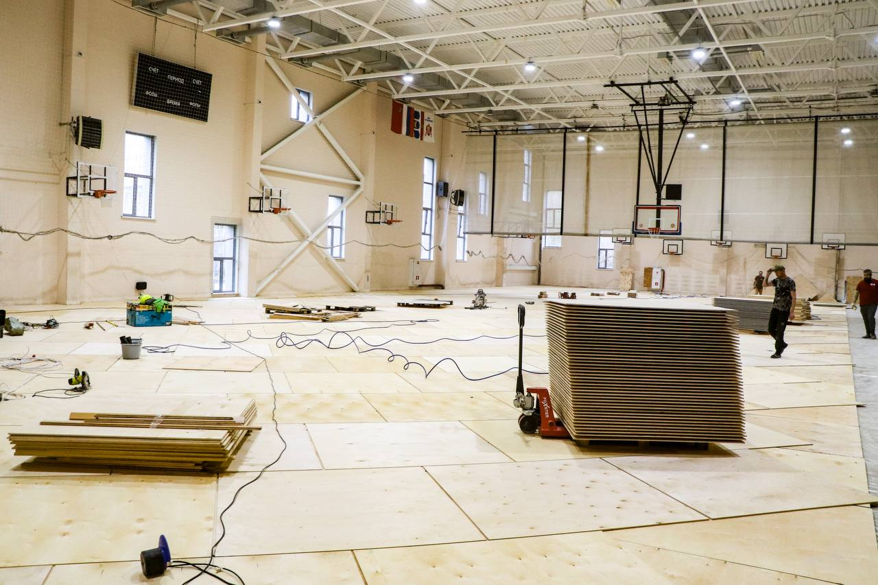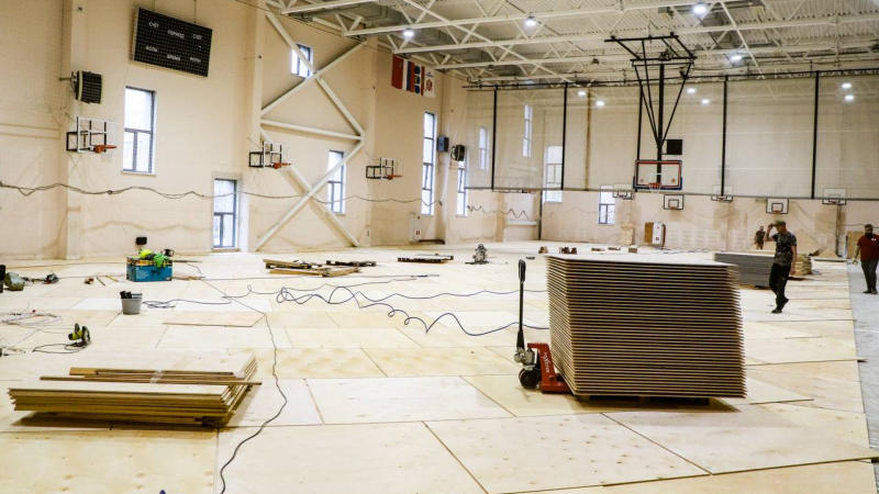 На сегодняшний день ведется укладка пароизоляционной пленки и двойного слоя фанеры со специальными резиновыми амортизаторами. Такое профессиональное покрытие уменьшит нагрузку на коленные суставы спортсменов и снизит травмоопасность.