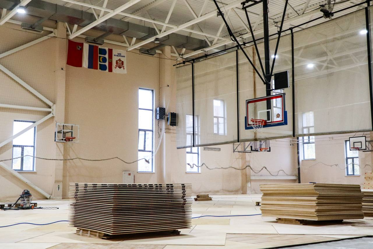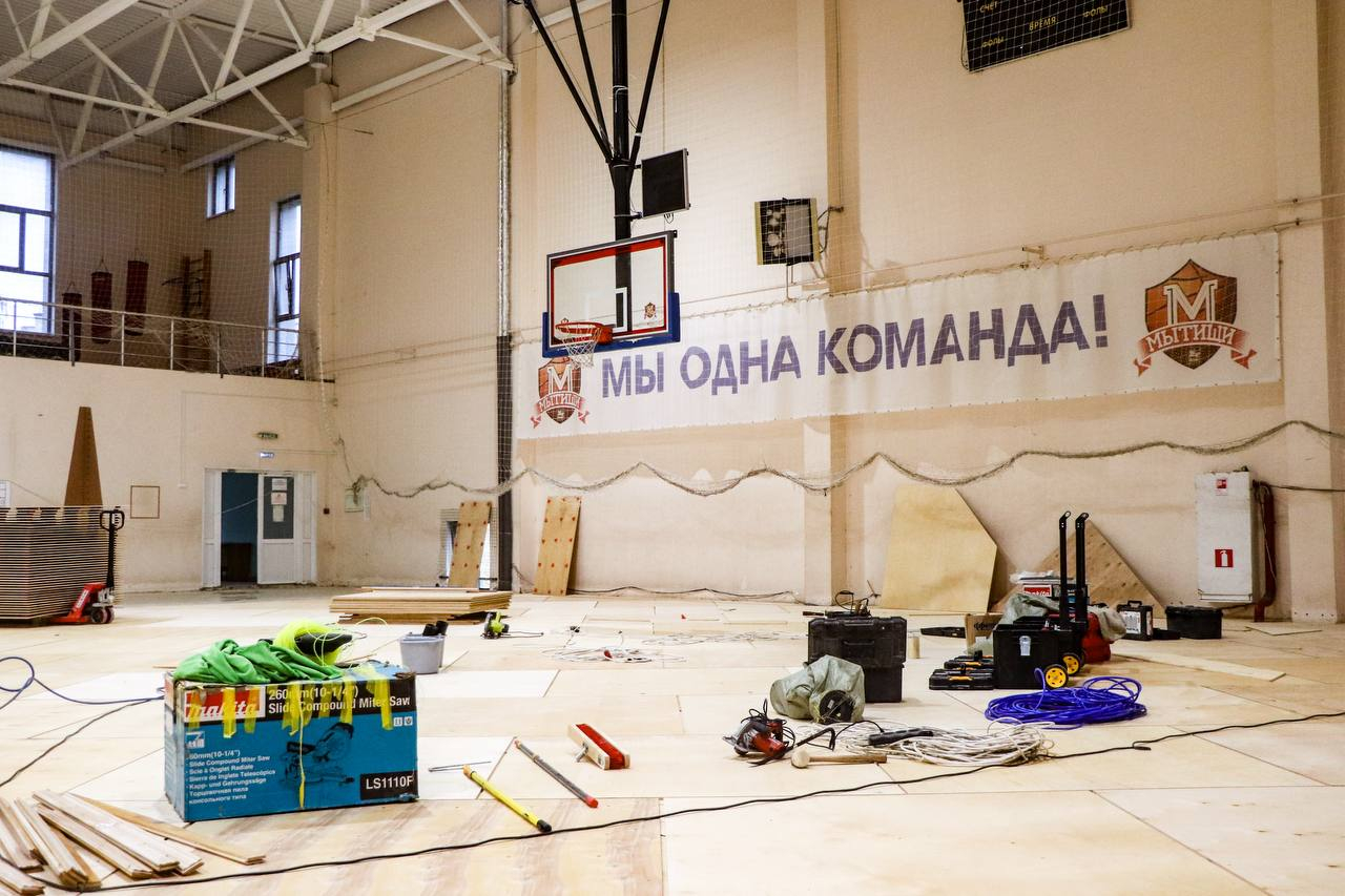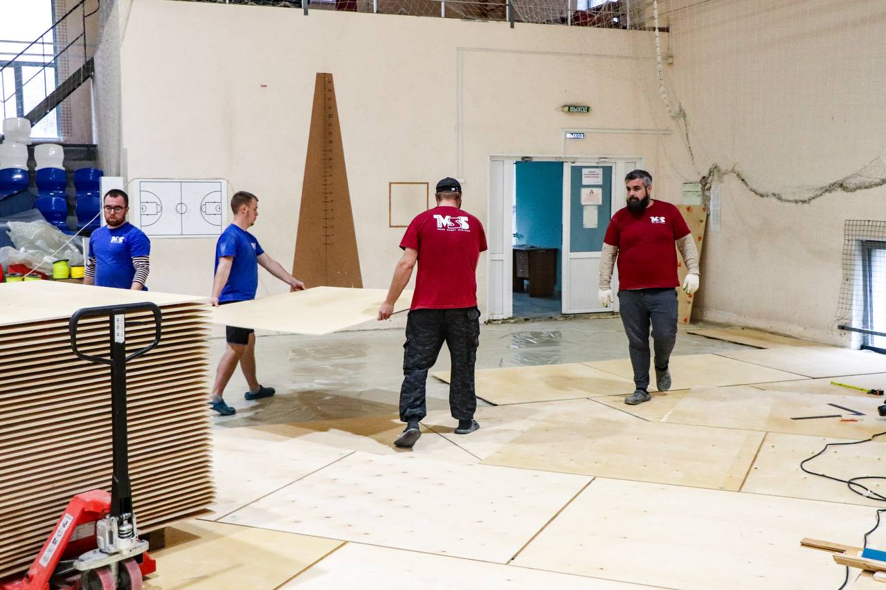 На сегодняшний день ведется укладка пароизоляционной пленки и двойного слоя фанеры со специальными резиновыми амортизаторами. Такое профессиональное покрытие уменьшит нагрузку на коленные суставы спортсменов и снизит травмоопасность.