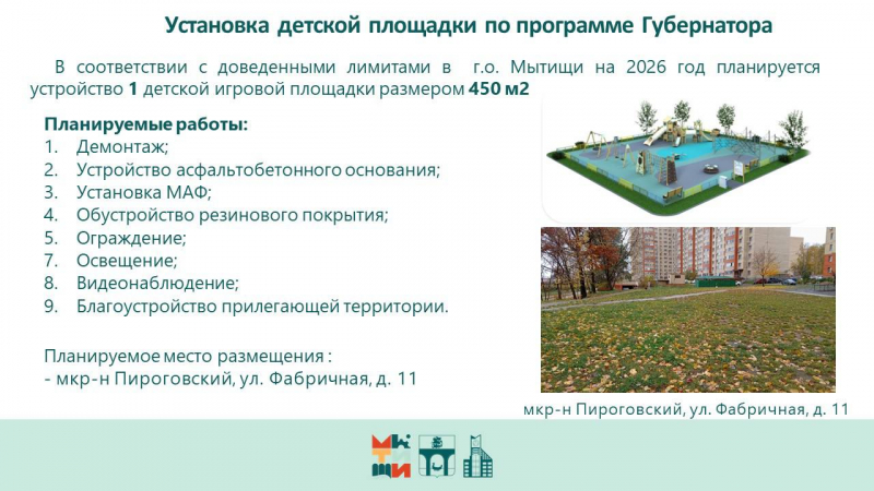 Установить детскую площадку по программе губернатора Московской области Андрея Воробьева в мкр. Пироговский на ул. Фабричной, д. 11