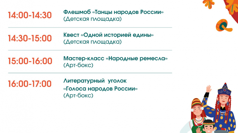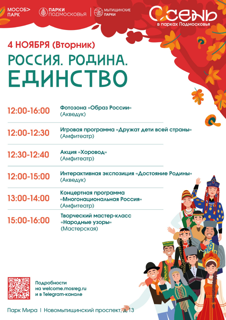 Вас ждет насыщенная программа, включающая народные игры, концерт, мастер-классы и многое другое. День народного единства призван не только развлечь, но и напомнить о важности солидарности и взаимопонимания.