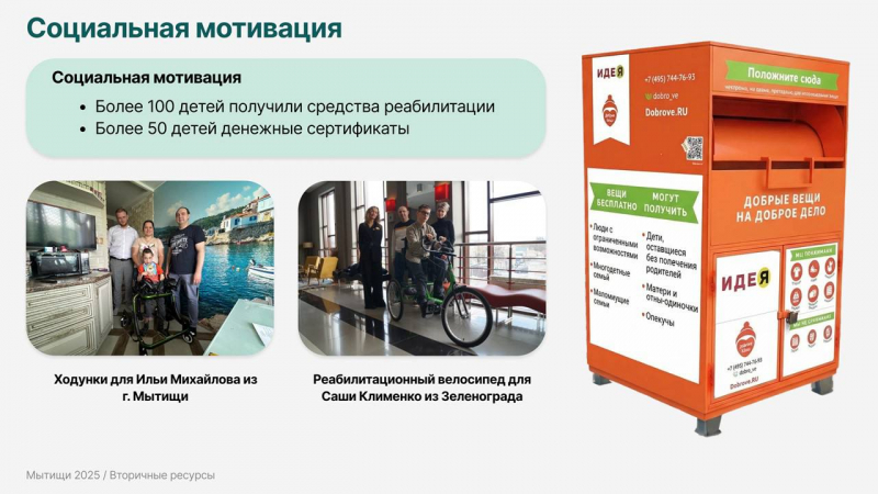Дополнительно реализуются благотворительные проекты. Благодаря последней акции удалось приобрести специальные ходунки для Ильи из Мытищ и велосипед для Саши из Зеленограда.