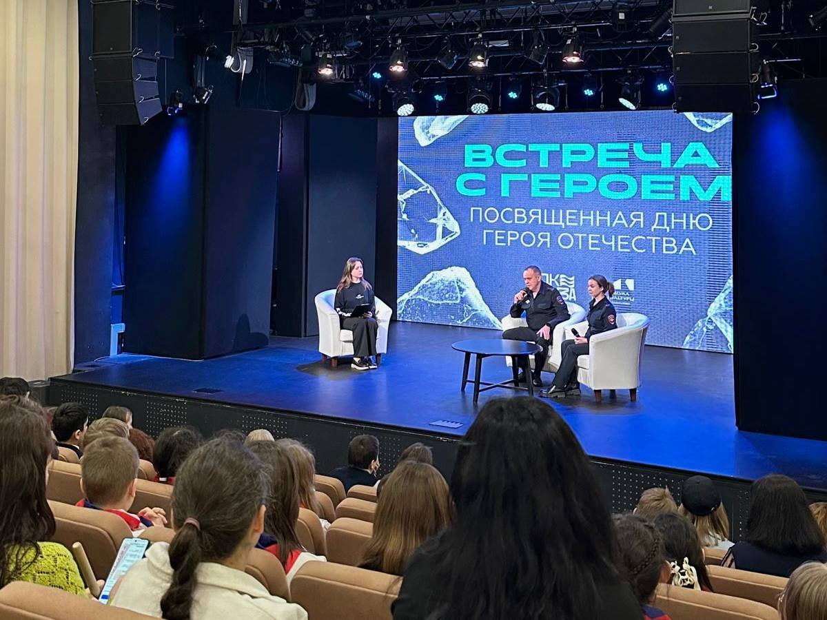 Врио заместителя командира ОБППСП МУ МВД России «Мытищинское» капитан полиции Максим Бакланов и инспектор ОРЛС МУ МВД лейтенант полиции Евгения Васильева приняли участие в акции «Встреча с героем», посвященной Дню Героев Отечества.