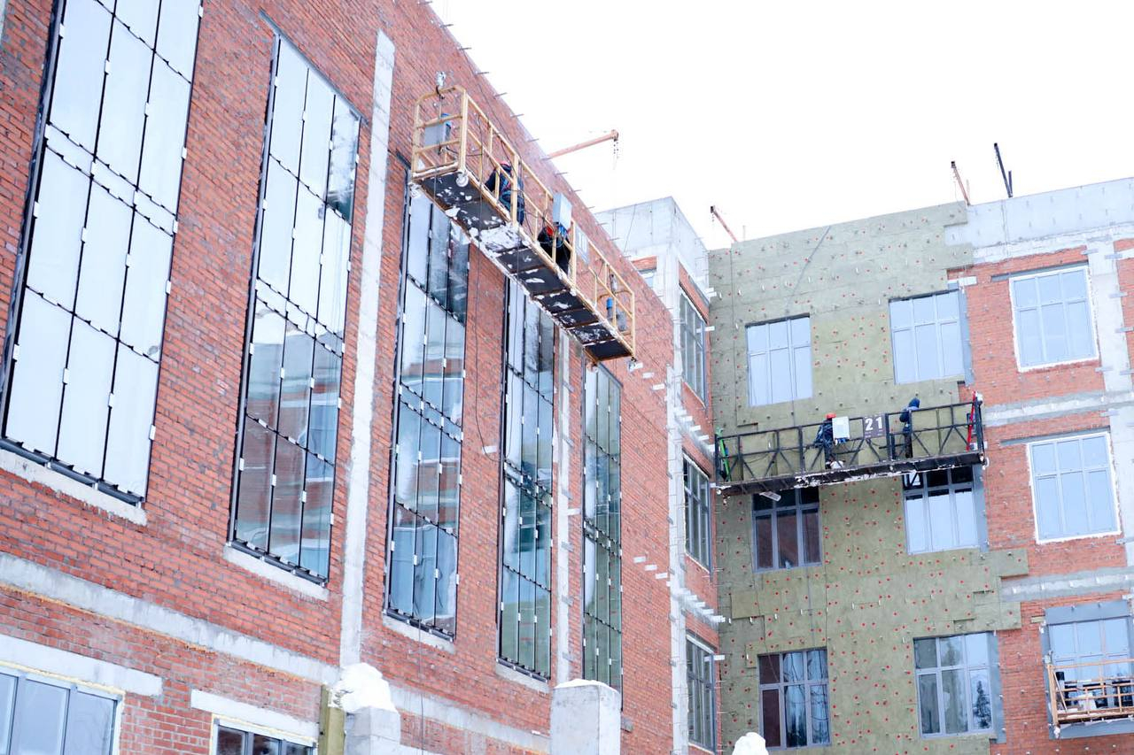 На объекте продолжается отделка фасада. Установлены оконные витражи, ведется утепление их примыканий.