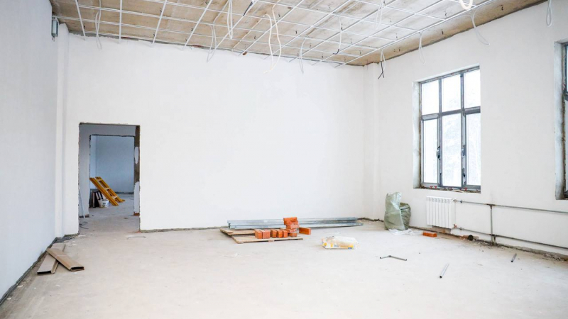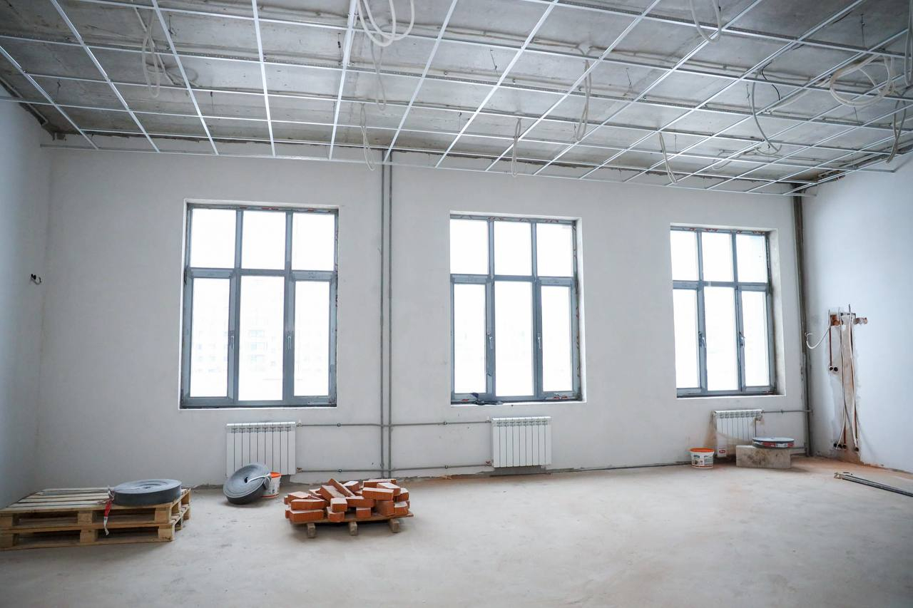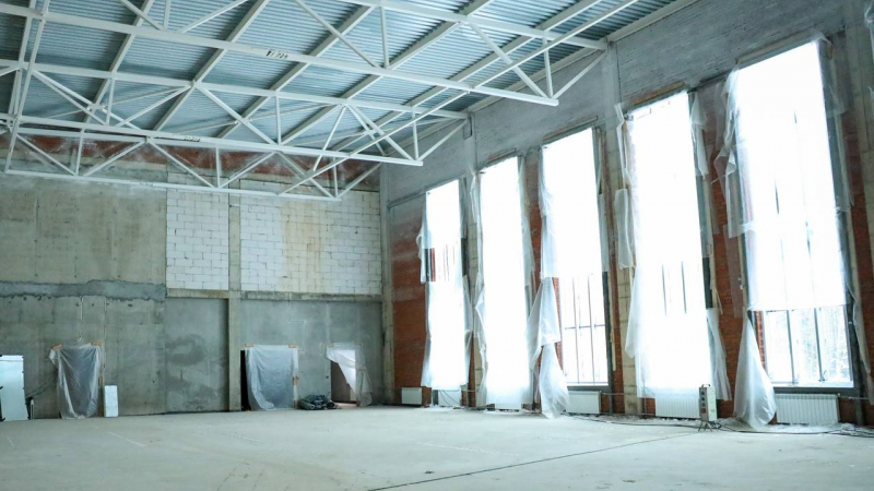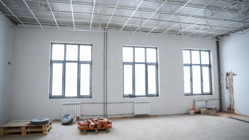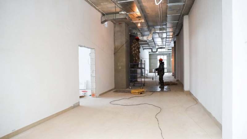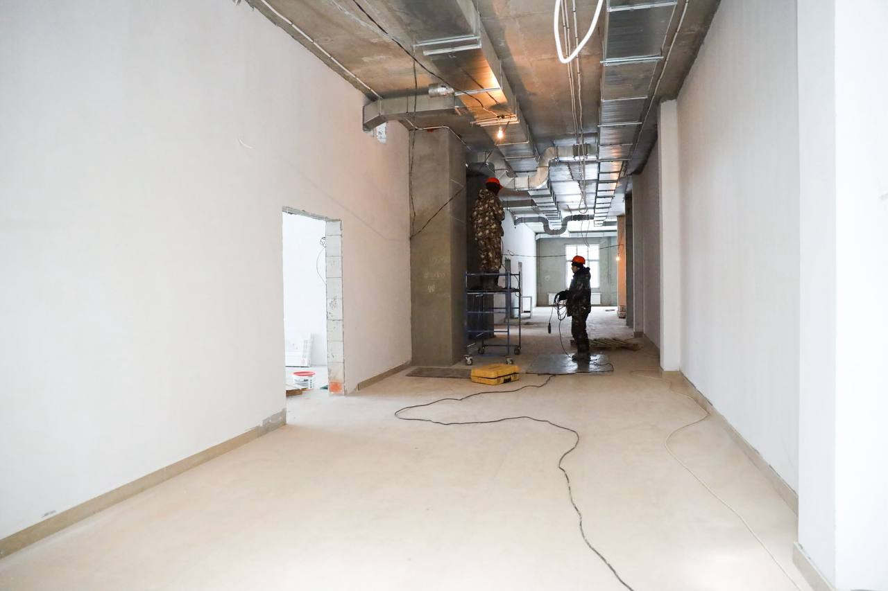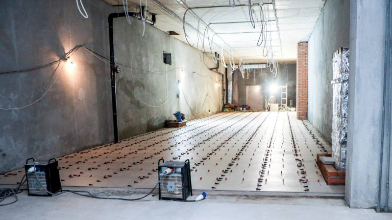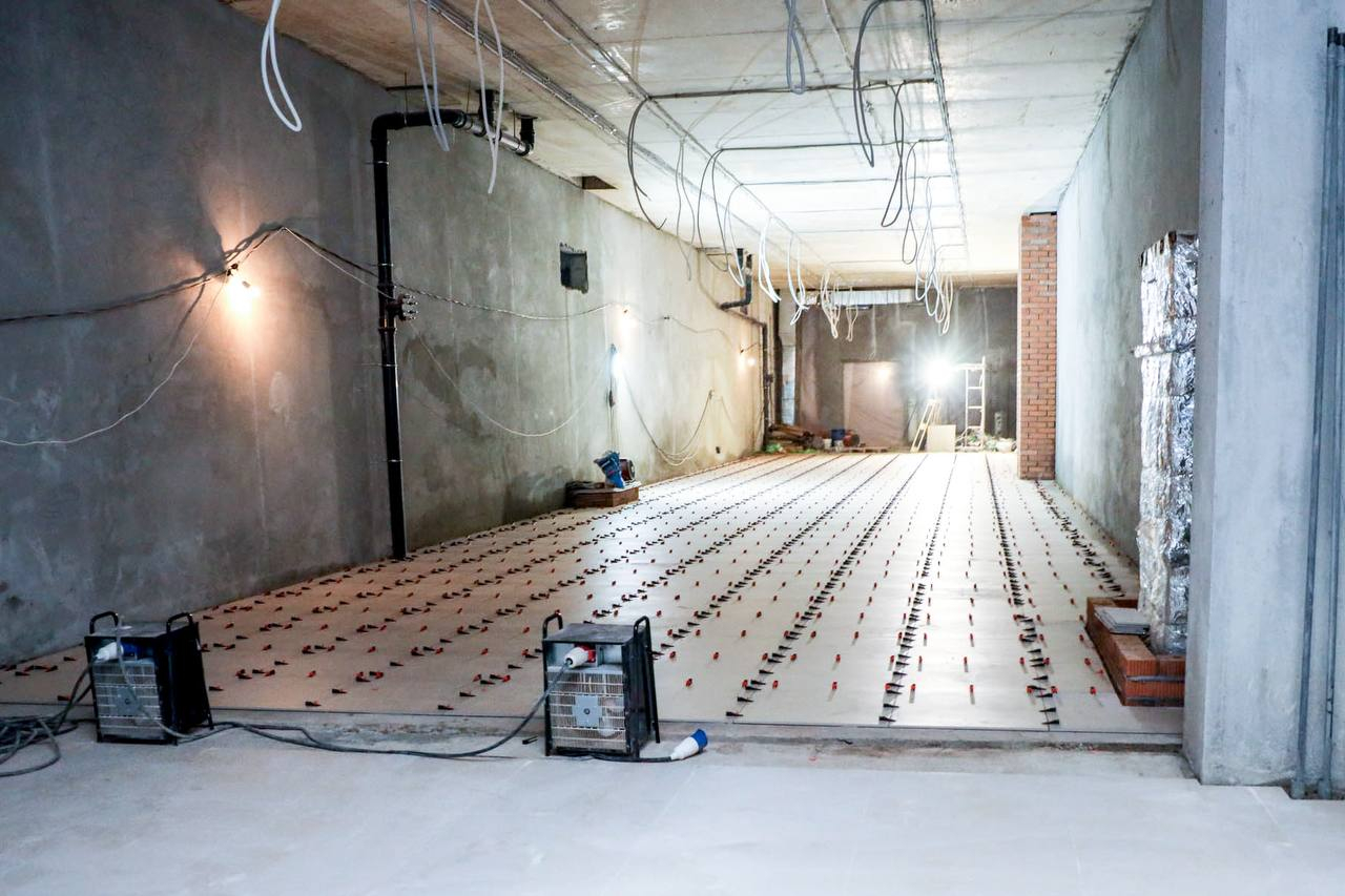 Внутри здания запущено тепло по блокам, проводится чистовая отделка и монтаж инженерных коммуникаций.