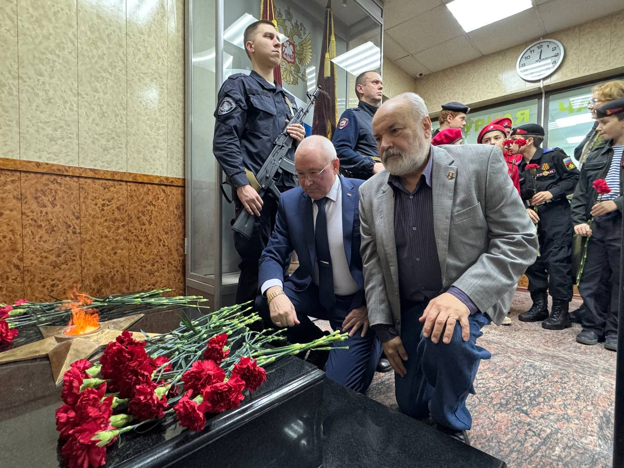 В День памяти погибших при выполнении служебного долга сотрудников органов внутренних дел заместитель начальника МУ МВД России «Мытищинское» полковник внутренней службы Сергей Ролдугин, председатель Общественного совета Геннадий Старцев и член совета Вячеслав Муравьев, председатель Совета ветеранов Юрий Жигулин, ветераны и юнармейцы провели церемонию возложения цветов к Вечному огню.