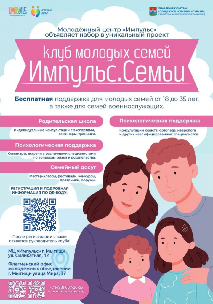Молодежный центр «Импульс» приглашает молодых родителей присоединиться к клубу молодых семей. Проект рассчитан на жителей в возрасте от 18 до 35 лет и предоставляет бесплатную комплексную поддержку молодым родителям.