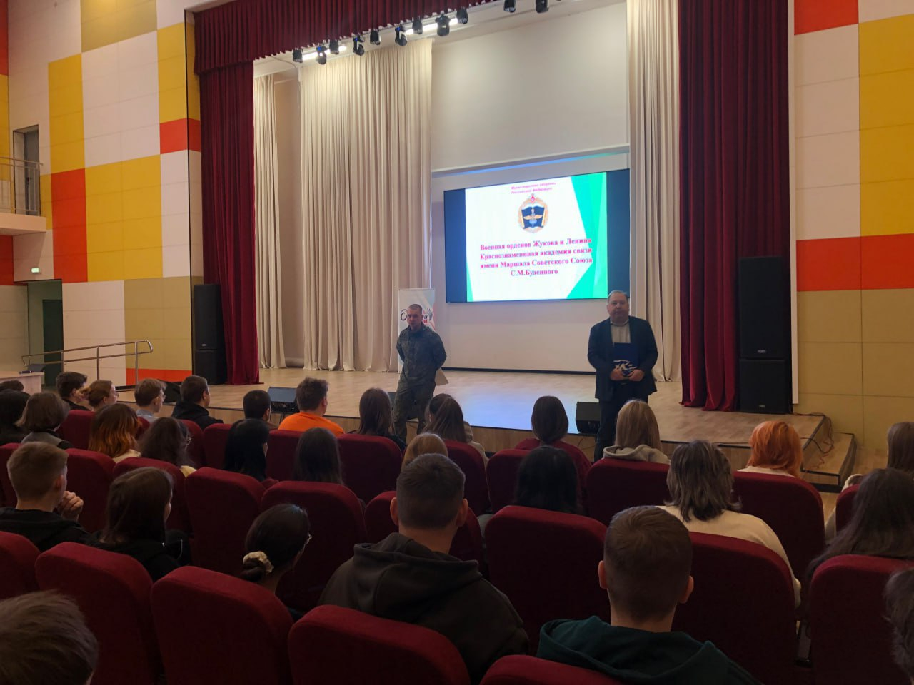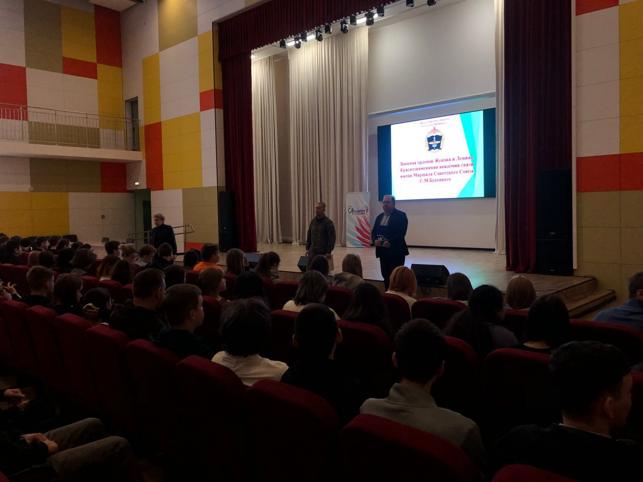 В рамках профориентационной работы Михаил Владимирович рассказал ребятам о возможностях получения образования в Новочеркасском высшем военном командном училище связи имени маршала Советского союза В.Д. Соколовского. Он подробно изложил преимущества обучения именно в этом учебном заведении, познакомил выпускников с особенностями вступительных экзаменов, условиями проживания курсантов и перспективами дальнейшего трудоустройства.