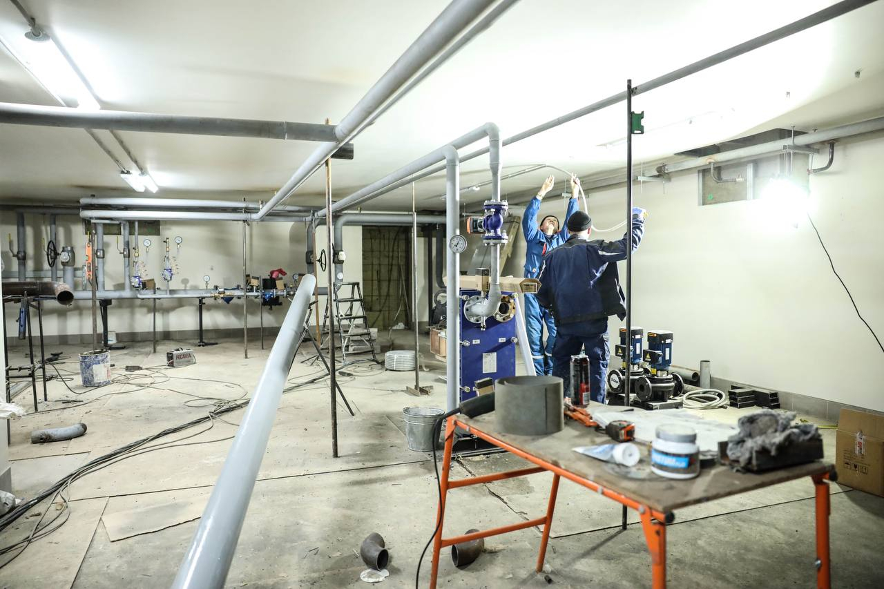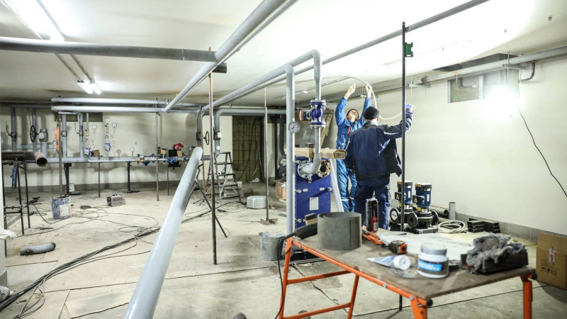 На сегодняшний день ведутся утепление и отделка фасадов, герметизация оконных примыканий. В индивидуальном тепловом пункте идет опрессовка и промывка основных магистралей. Готовится подача тепла в помещения по временной схеме.