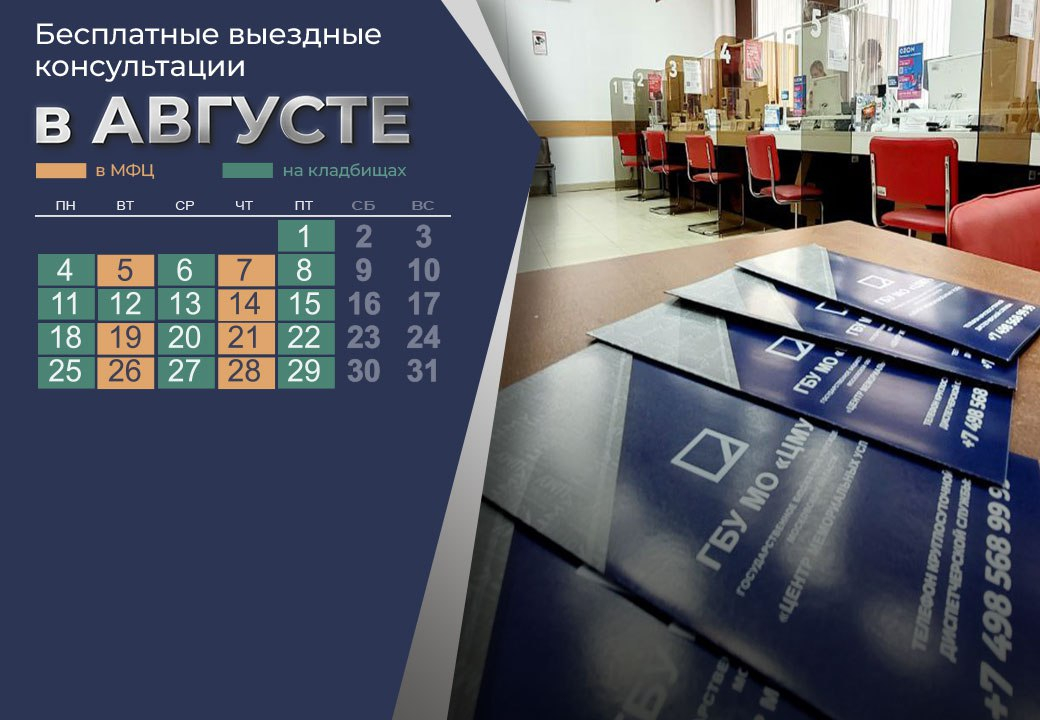 Спешите получить консультацию в МФЦ вашего города, согласно графику выездов, от специалистов ГБУ МО «Центр мемориальных услуг». Если вы хотите узнать о законодательстве в сфере погребения и похоронного дела - приходите в МФЦ на консультацию. Наши специалисты ответят на все интересующие вас вопросы.