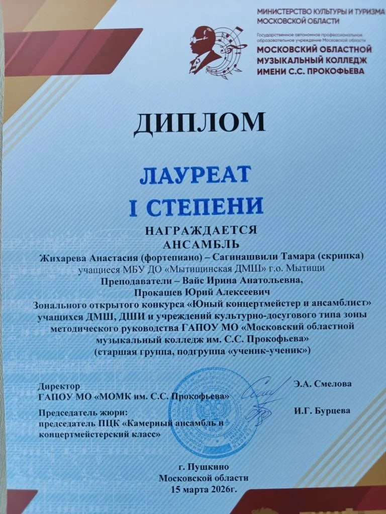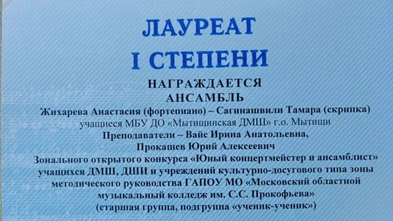 Ансамбль Мытищинской ДМШ в составе Анастасии Жихаревой (фортепиано) и Тамары Сагинашвили (скрипка) стал Лауреатом I степени на Зональном открытом конкурсе «Юный концертмейстер и ансамблист».