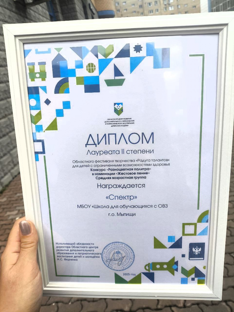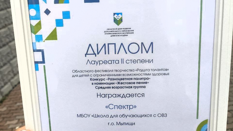 Творческий коллектив «СПЕКТР» получил диплом II степени в номинации «Жестовое пение» за песню «Мамочка моя». Солист коллектива, Иван Богданов, ученик 3 класса, занял третье место в той же номинации с песней «Не молчи».